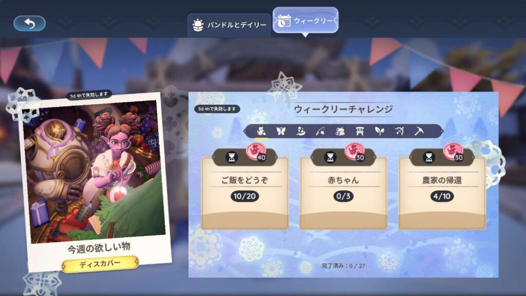 バンドル・デイリー・ウィークリー・村人の今週欲しい物の4つが確認できます。
