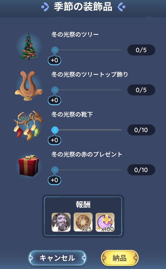 | 分ける食べ物 | レア材料 | 季節の装飾品 | プレゼント |